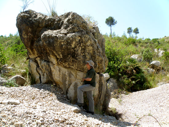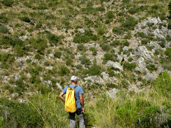Un sol de justícia ens feia suar de valent mentre intentàvem localitzar l’avenc que el “Visu” havia visitat feia força anys. Com ja be sent norma darrerament, la vegetació s’ha desenvolupat molt (abandonament del camp, no es treu fusta, etc.) i conseqüentment la fisonomia d’accés a les cavitats difereix molt de la que era habitual dues o tres dècades enrere. Sigui aquesta la causa, o l’oblit del nostre “guia”, el fet es que no vam trobar l’avenc.