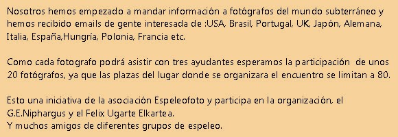 Hem rebut informació d’aquest interessant encontre, avalat per la competent capacitat dels organitzadors i alhora excel·lent grup de fotògrafs del mon subterrani. Us animem a què visiteu la seva pàgina web on trobareu informació de detall d’aquesta iniciativa i aprofiteu que se’ns anuncia amb suficient antelació per reservar-vos una plaça en aquesta trobada on podreu compartir no tant sols tècnica i esplèndides cavitats sinó sobretot unes relacions personals enriquidores amb especialistes del mes alt nivell.